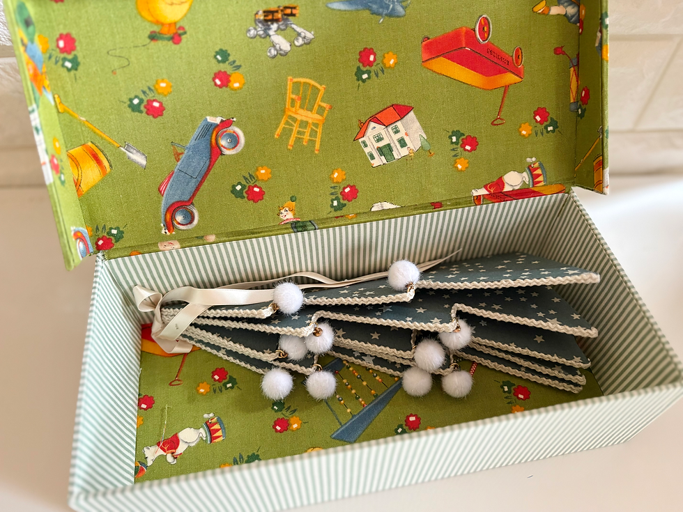 少しサイズを大きめにして2つ入りに。modaさんの生地がクリスマスプレゼントのような雰囲気でピッタリ❤️